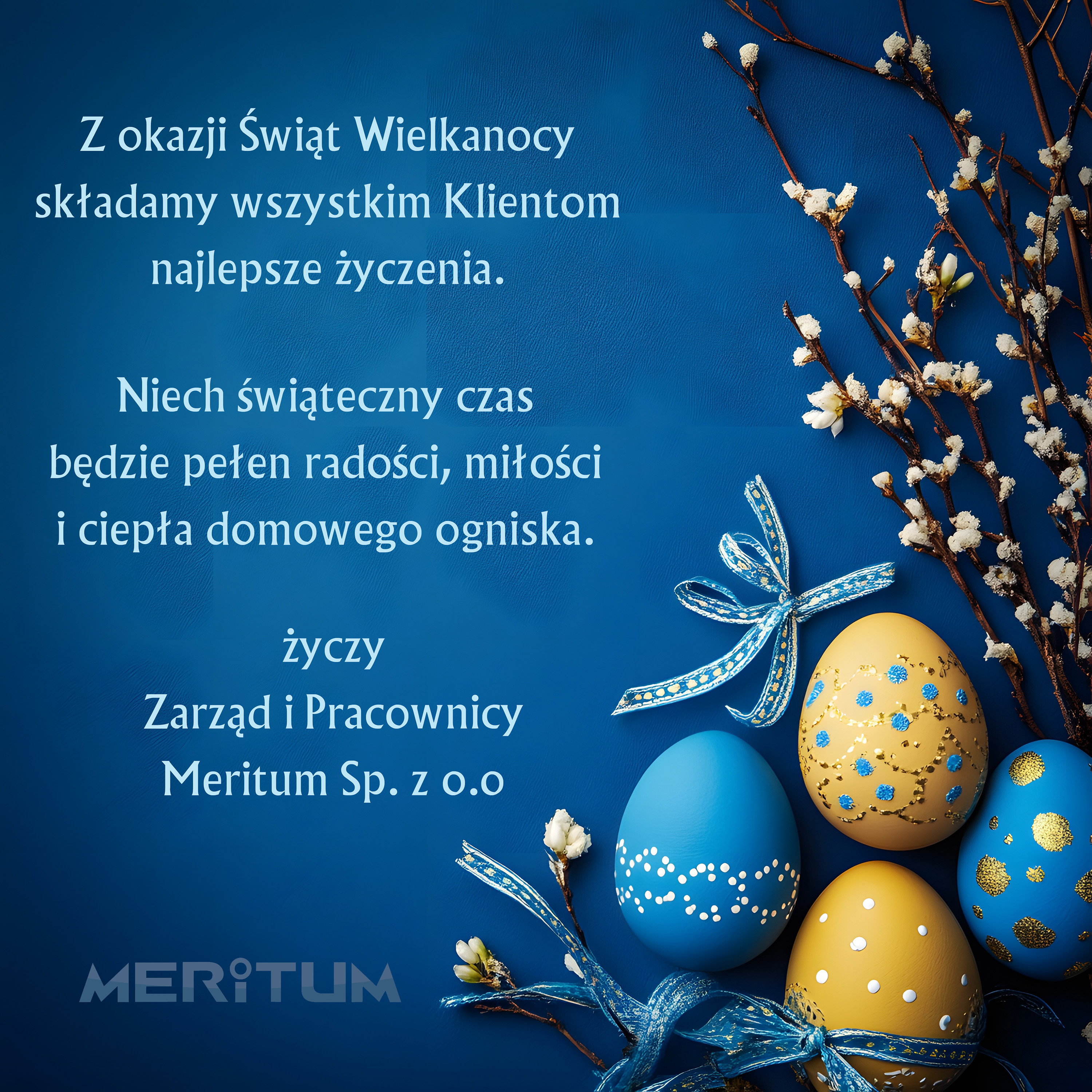 Z okazji Świąt Wielkanocy składamy wszystkim Klientom najlepsze życzenia. Niech świąteczny czas będzie pełen radości, miłości i ciepła domowego ogniska. życzy Zarząd i Pracownicy Meritum Sp. z o.o.